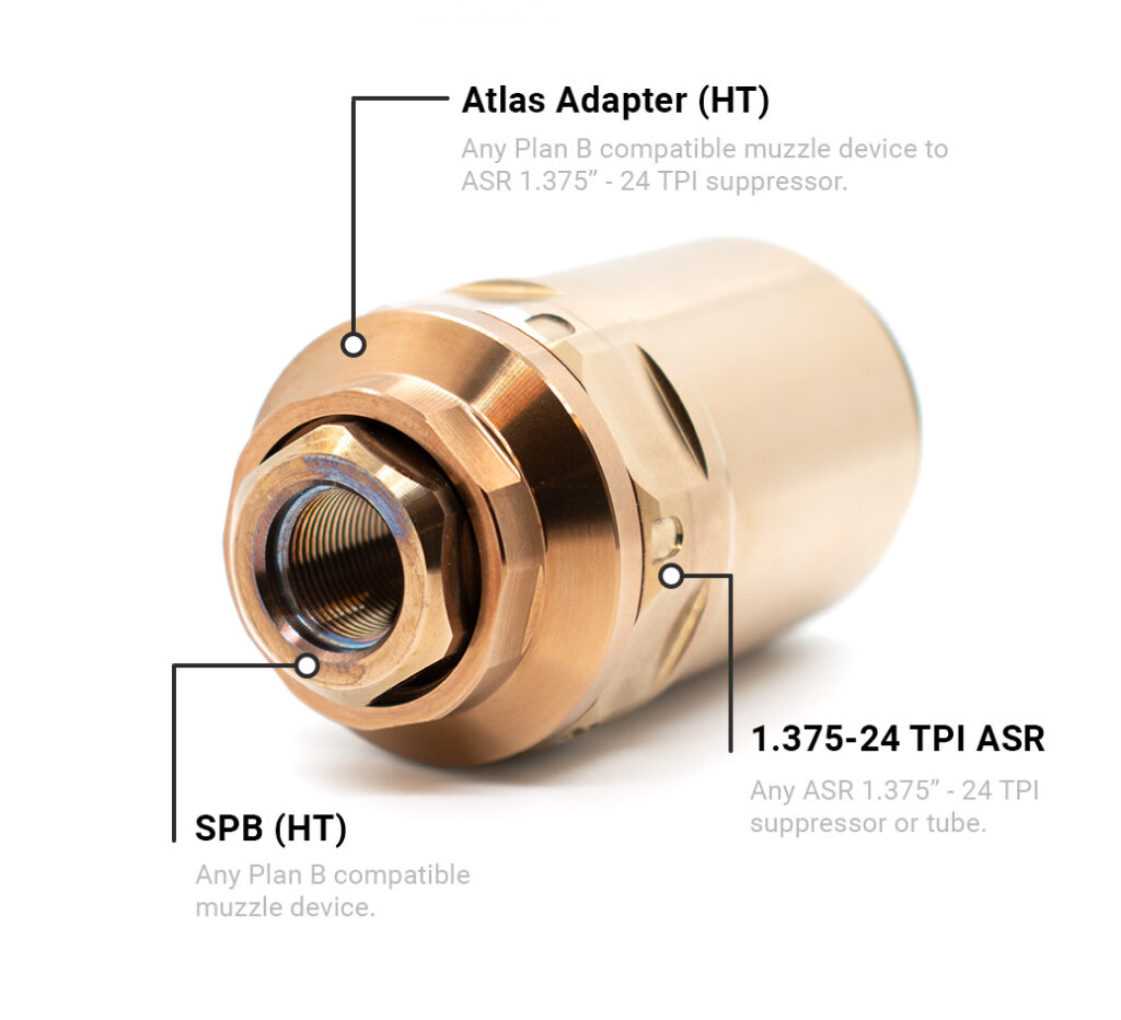 Any ASR (1.375″ – 24) threaded tube. Plan-B: OMEGA: SilencerCo Omega 300, Harvester Big Bore 338 & Hybrid | Dead Air Nomad | Energetic Armament VOX | YHM Turbo K.